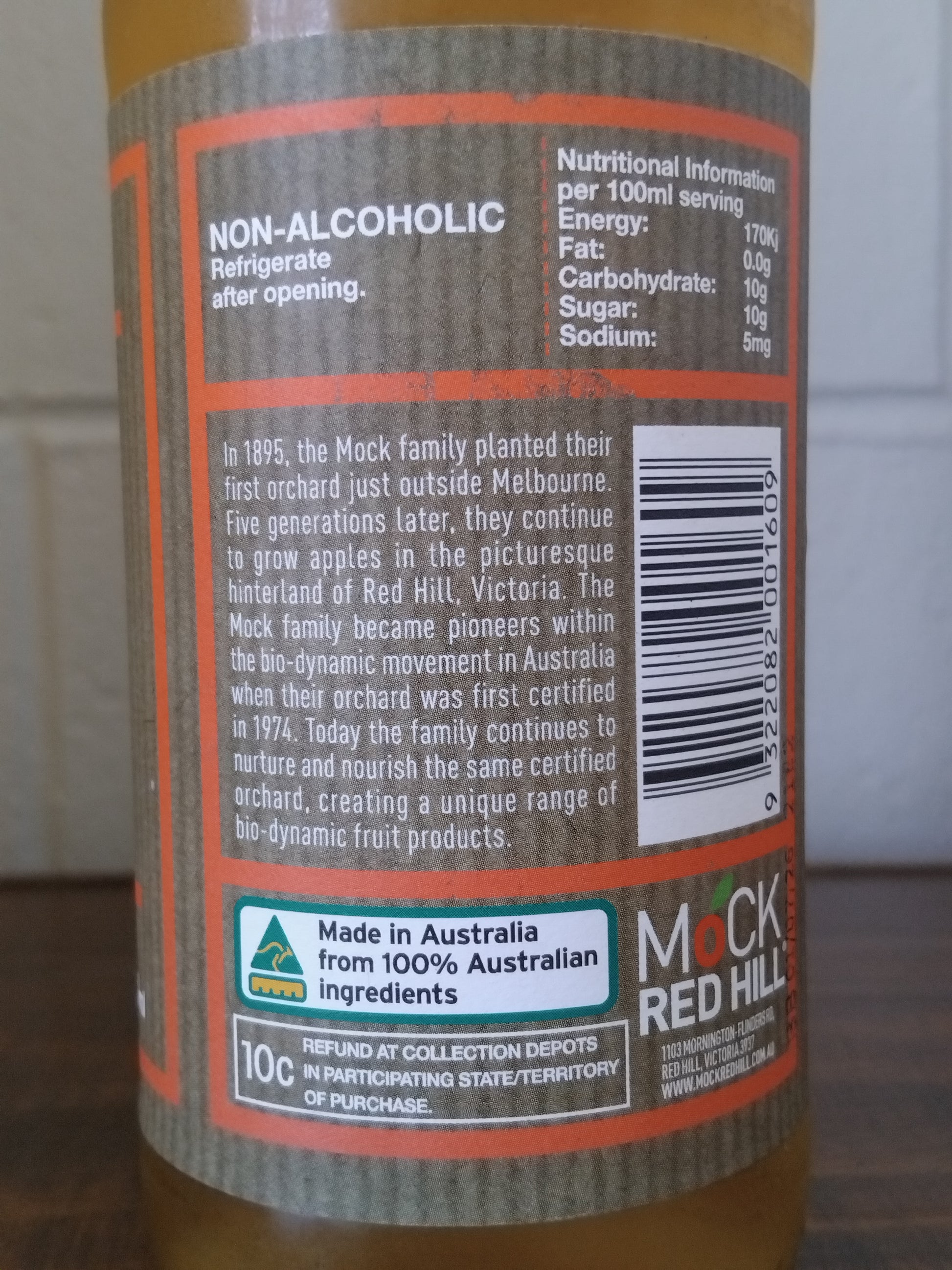 Mock Red Hill Bio-dynamic sparkling apple juice.